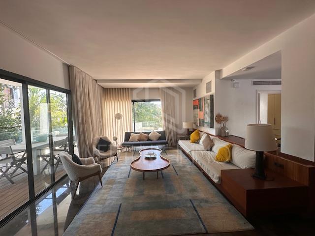 -Un salon avec baies vitrées donnant sur le jardin et la piscine